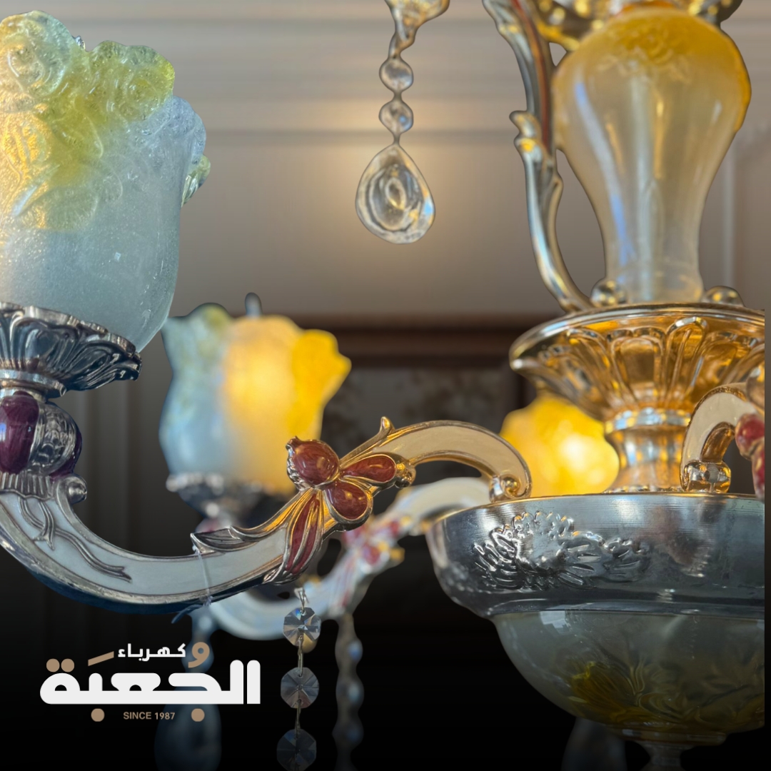 مواصفات الصنف : ثريا كلاسيكية ممزوجة باللون الخمري تحتوي على كاسات زجاجية فخمة مع حبات كريستال متدلية