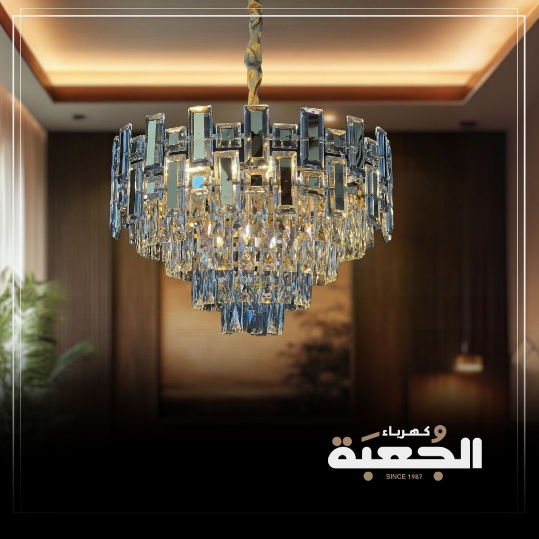 مواصفات الصنف : ثريا كريستالية باللون الفضي ممزوج بالمعدن تحتوي على حبات الكريستال الطولية تعطي طابع الفخامة