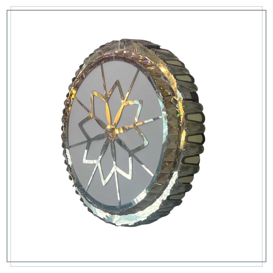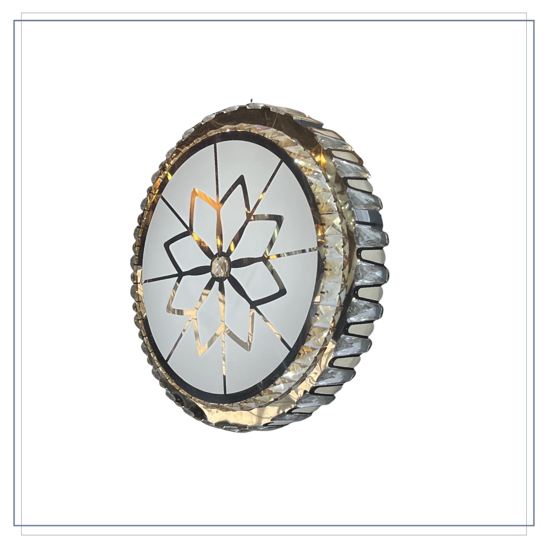 مواصفات الصنف : ثريا كريستال ثابتة بالسقف مع قاعدة دائرية الشكل , ممزوجة بطابع حديث تستخدم في عدة أماكن مثل الصالون