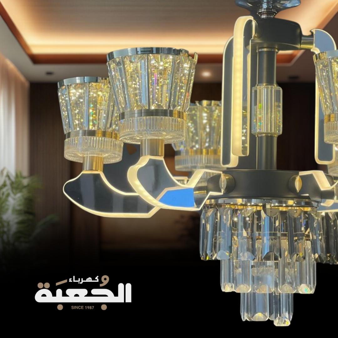 مواصفات الصنف : ثريا فخمة تجمع بين الطابع الكريستالي والحديث تتكون من 6 أذرع تحتوي على حبات كريستالية مرصعة وكاسات كريستال مع اكريليك ابيض