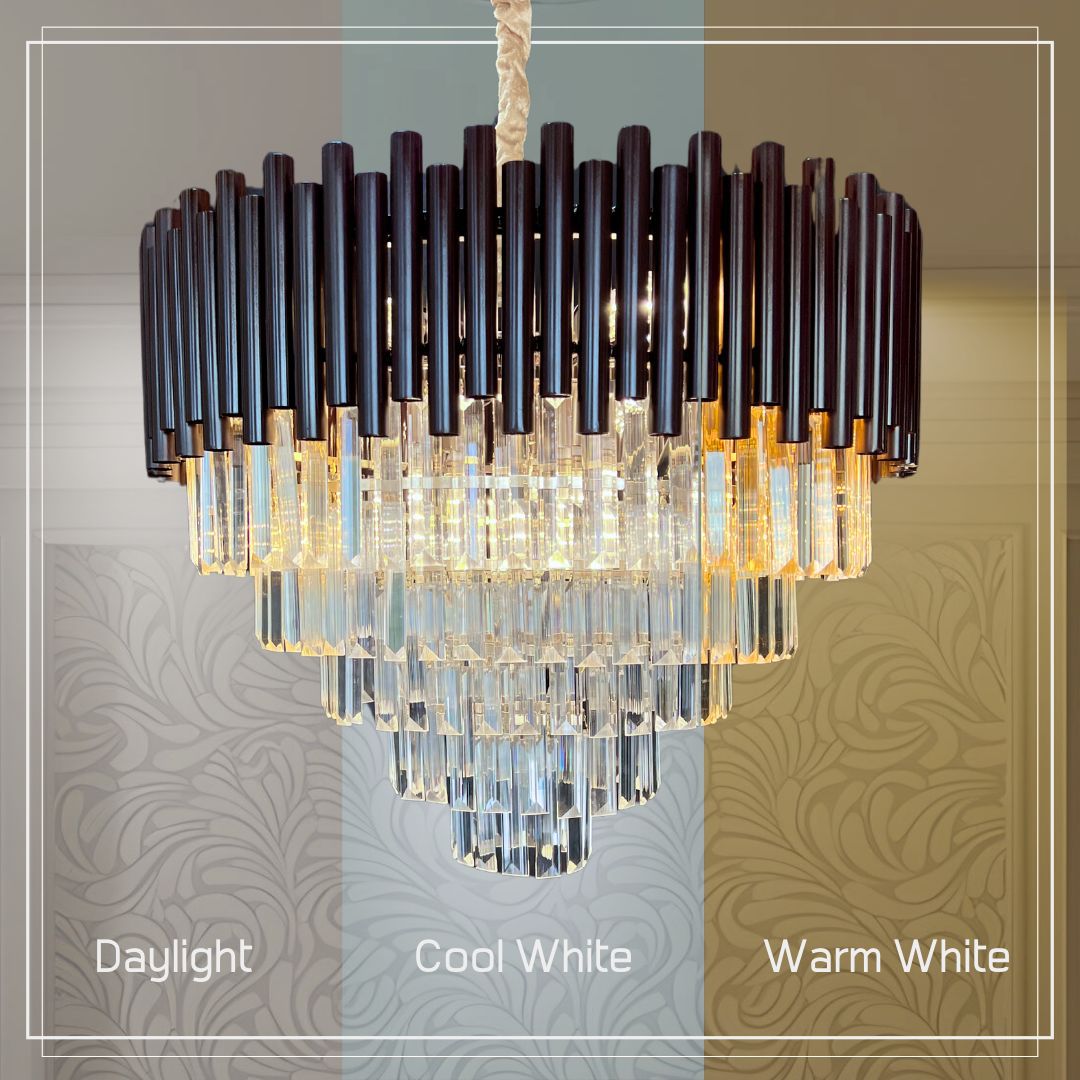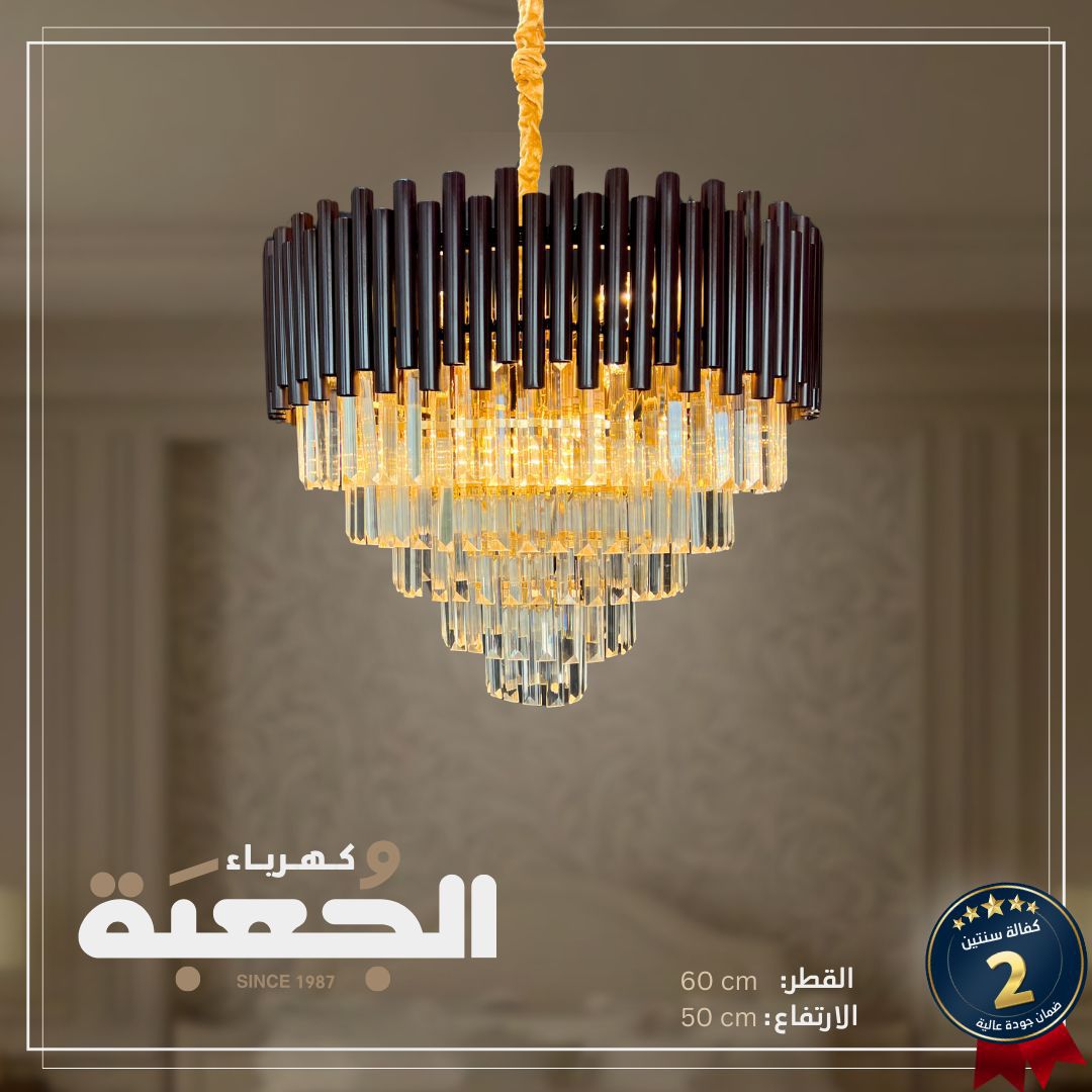مواصفات الصنف : ثريا من طبقات كريستالية مع معدن اسود بشكل فخم وأنيق تحتوي على 12 لمبة من نوعية E14