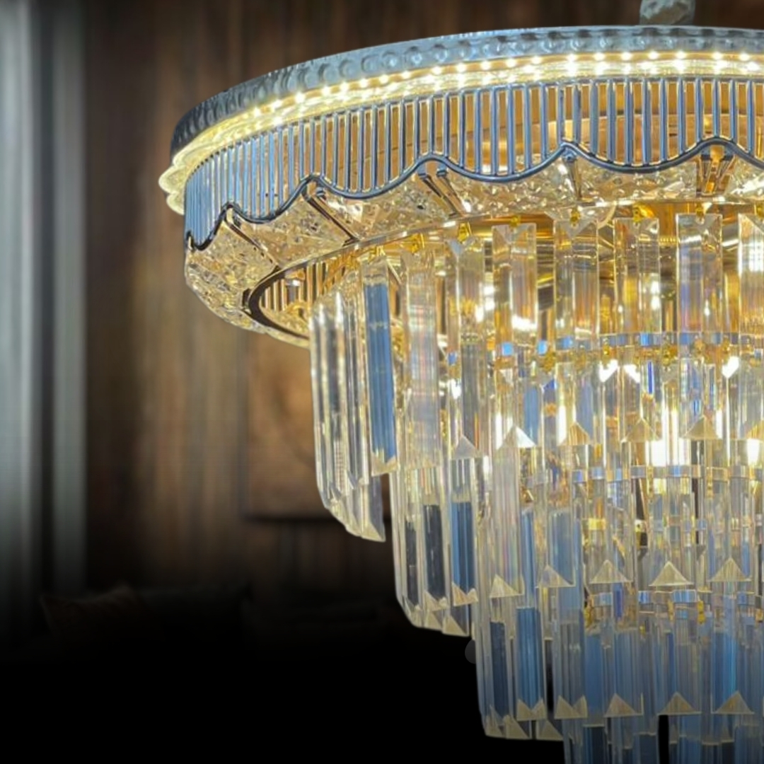 مواصفات الصنف : ثريا كريستالية باللون البرونزي تعطي طابع الفخامة من طبقات تحتوي على حبات الكريستال الطولية