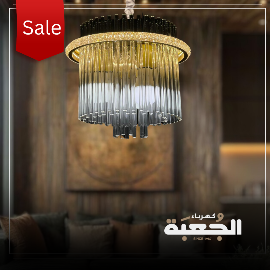 مواصفات الصنف : ثريا كريستالية باللون الذهبي مع قاعدة باطار كريستالي وحبات زجاج متدلية